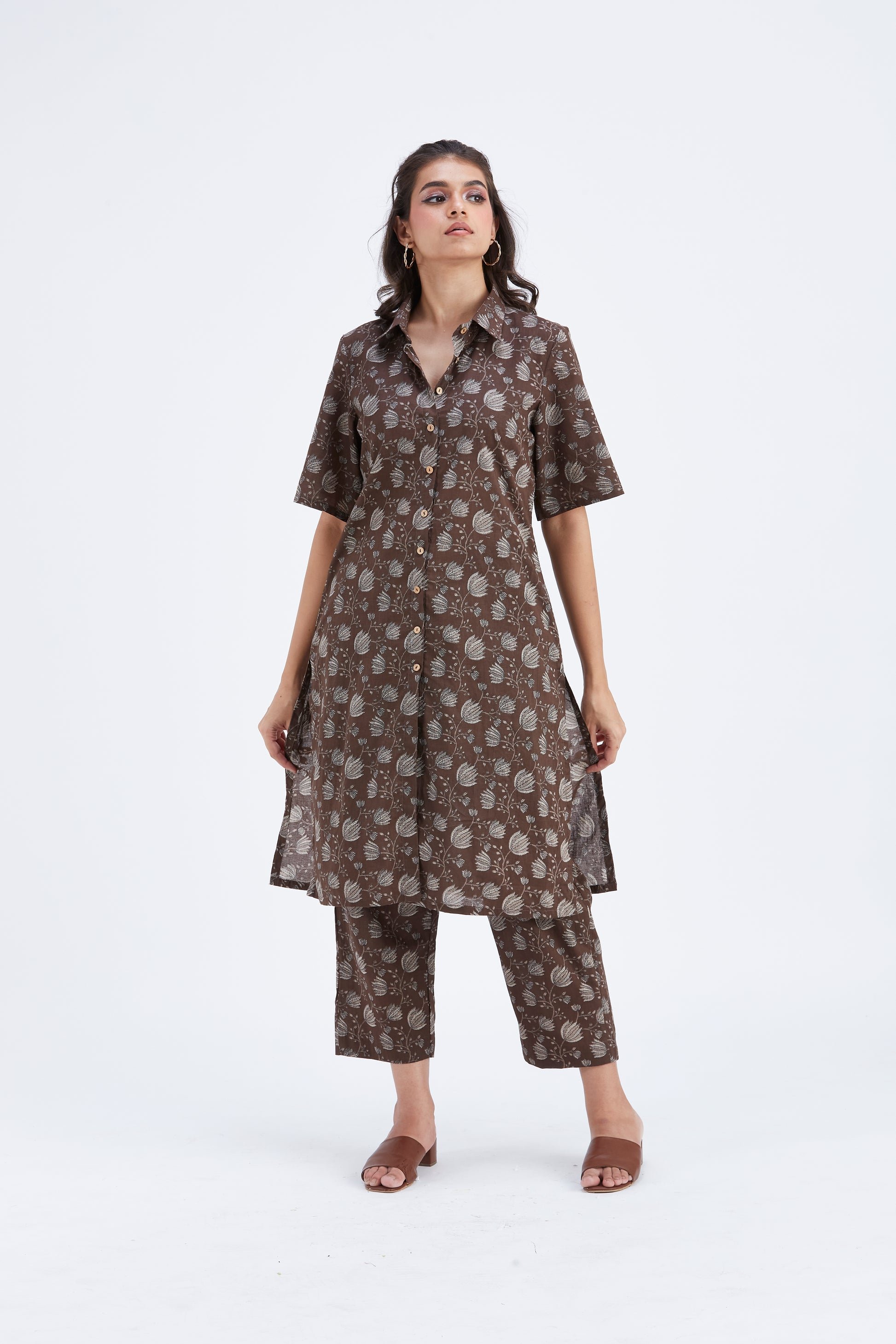 The Easha Brown Kurta Set is your warm-weather essential — designed for comfort, crafted for compliments. Featuring a knee-length kurta paired with easy, tapered pants, this set is cut from breathable fabric with an all-over floral print that brings softness and charm.