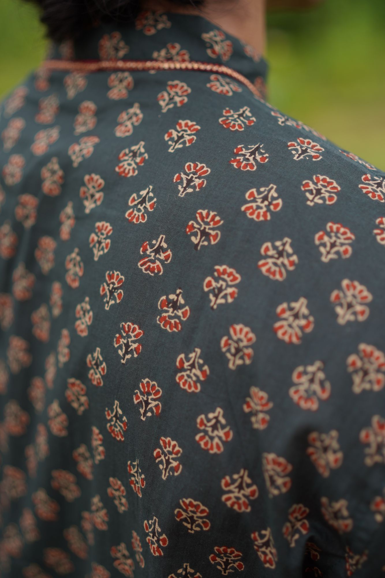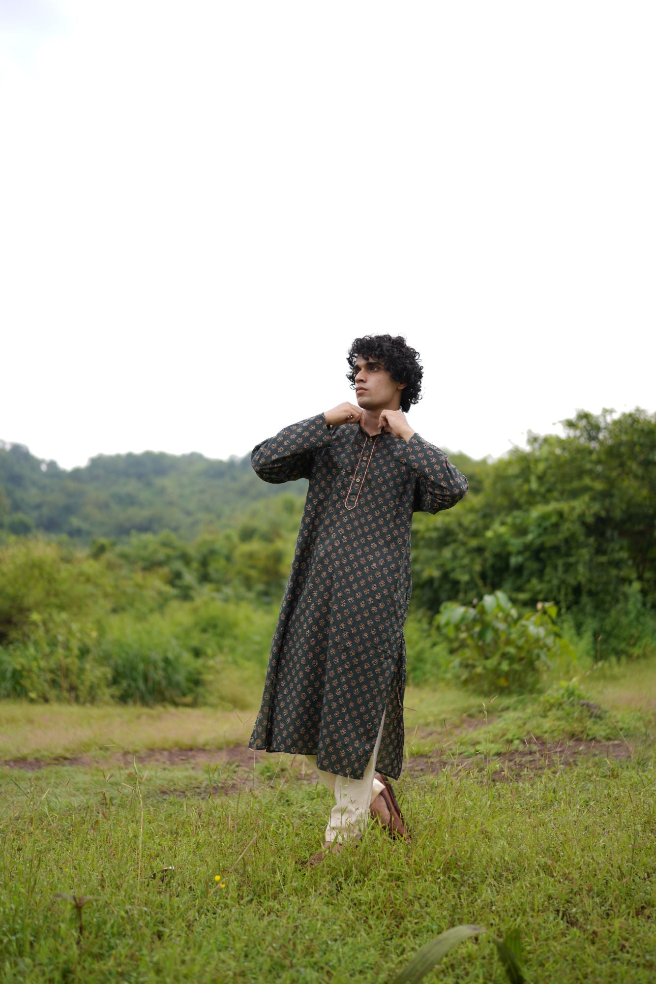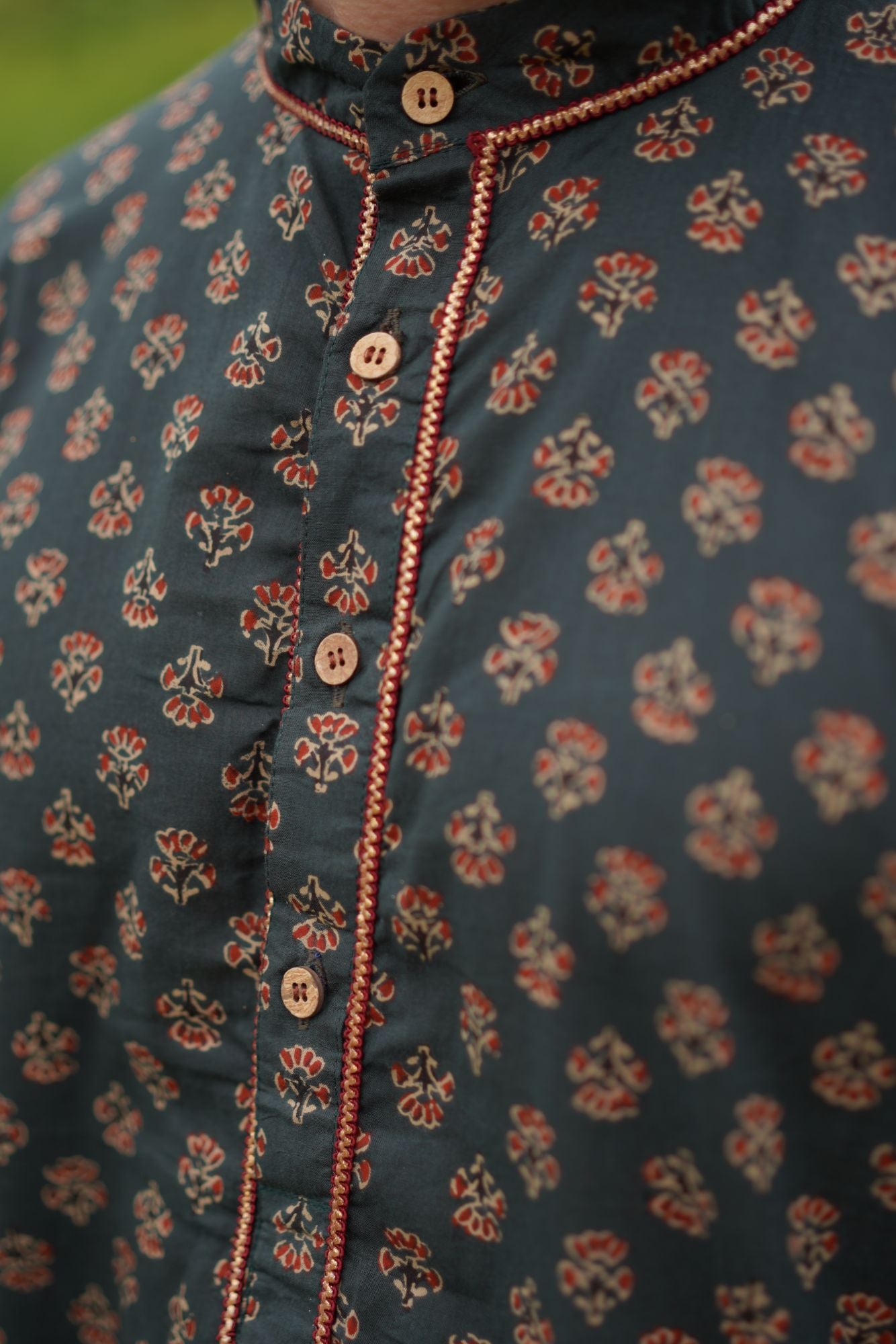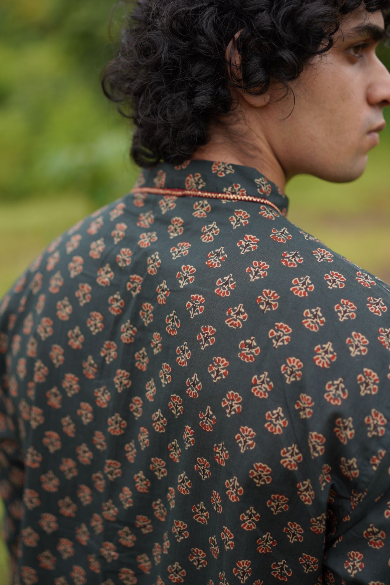 Kurta ajrakh vert fabriqué à la main pour homme avec une coupe régulière, un col mandarin et deux poches latérales.