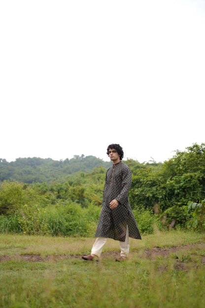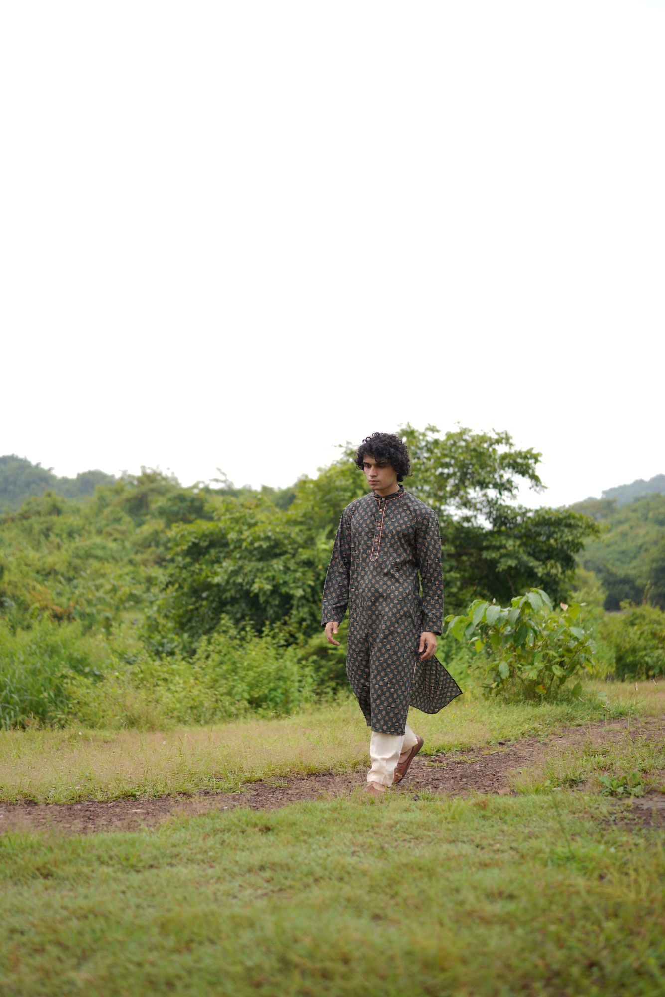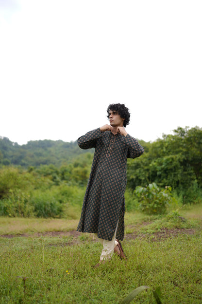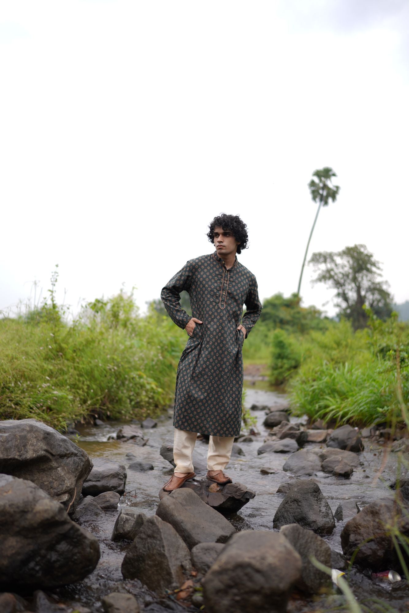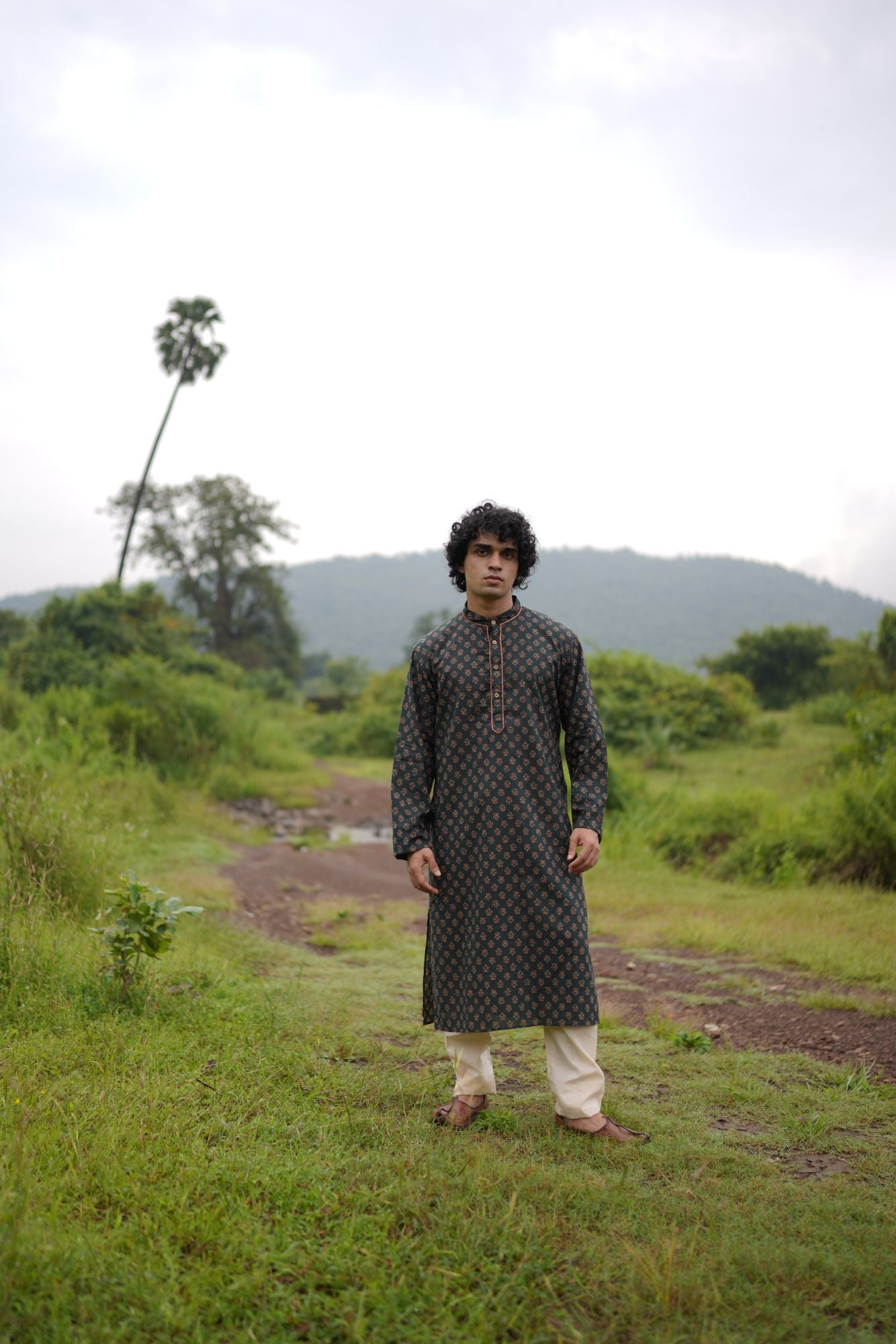 Kurta ajrakh vert fabriqué à la main pour homme avec une coupe régulière, un col mandarin et deux poches latérales.