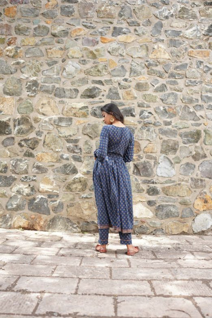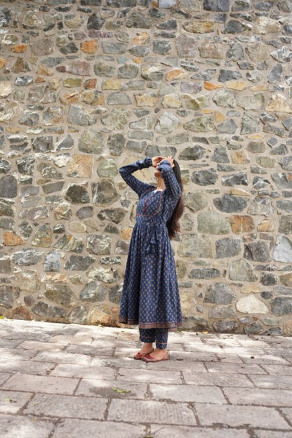 Un magnifique ensemble Kurta bleu avec des imprimés et des broderies rouges et blancs. Le Heer Kurta est un élégant kurta de style chudidhar avec des détails d'empiècement et d'ouverture à boutons, et une cravate sur le côté et les poches. Il y a de petits détails de broderie sur le kurta et le pantalon. Le pantalon droit tombe facilement sur les hanches et les cuisses avec une ceinture élastiquée et une large ouverture en bas. Le produit se compose d'un Kurta, d'un pantalon et d'une dupatta avec broderie miroir.