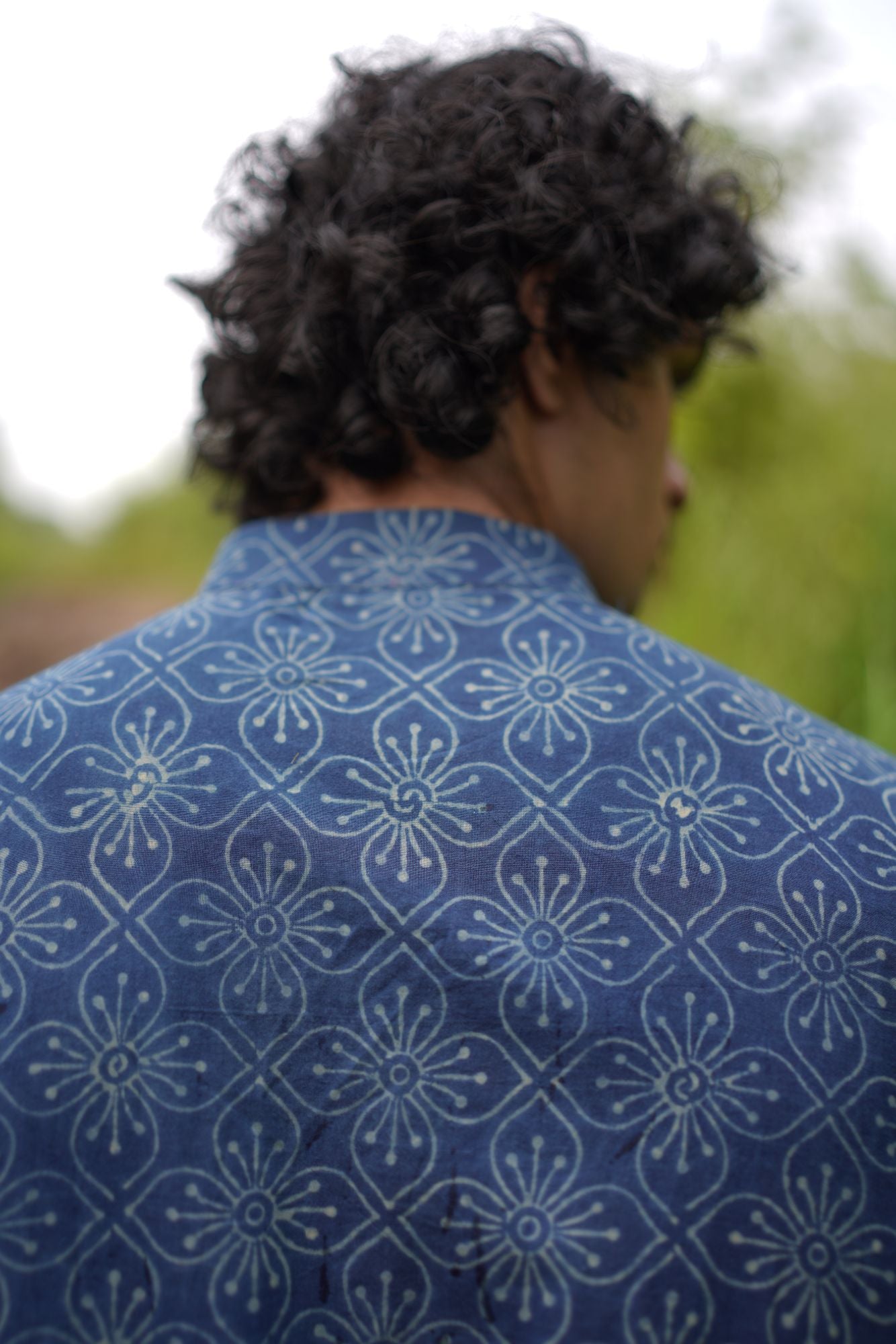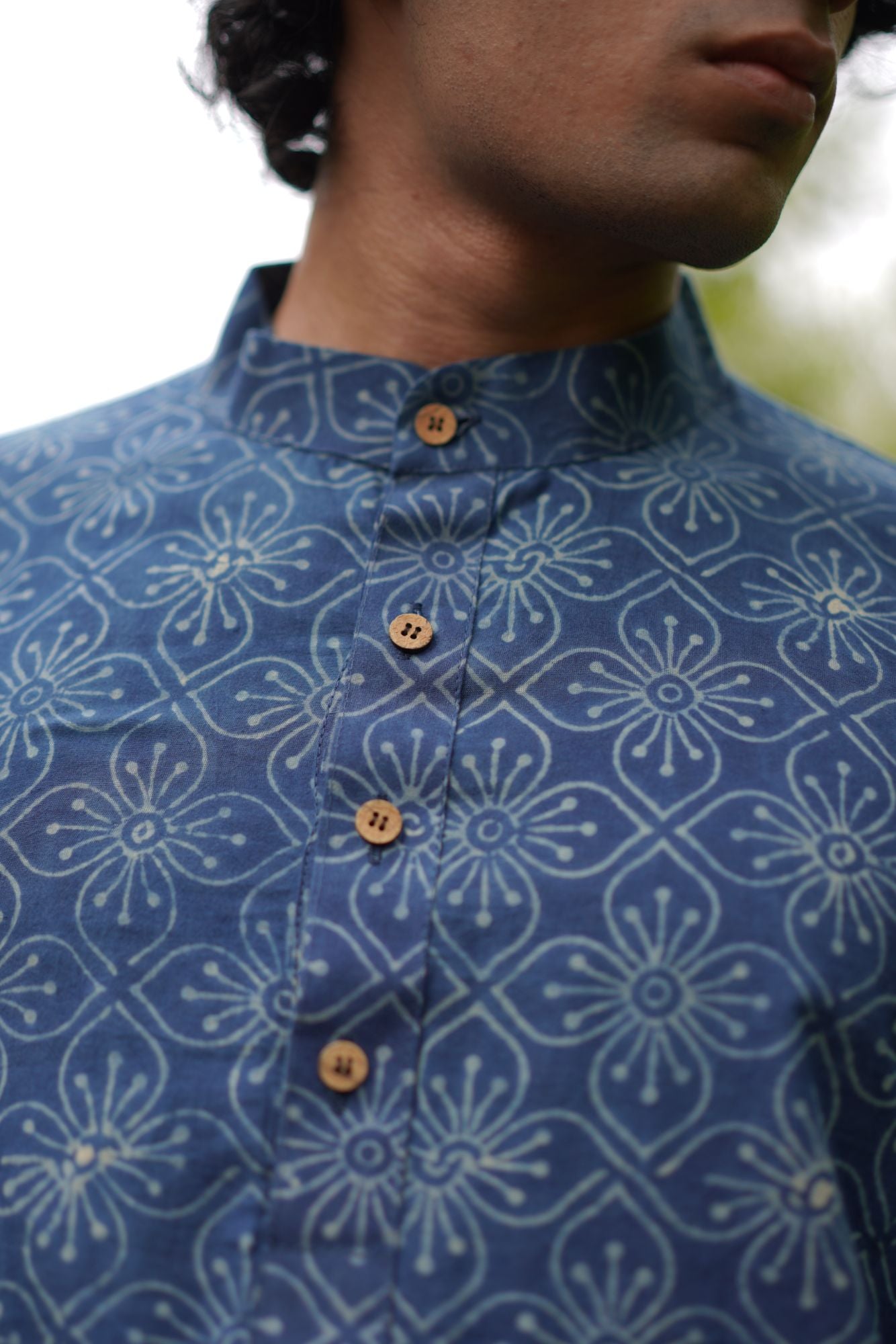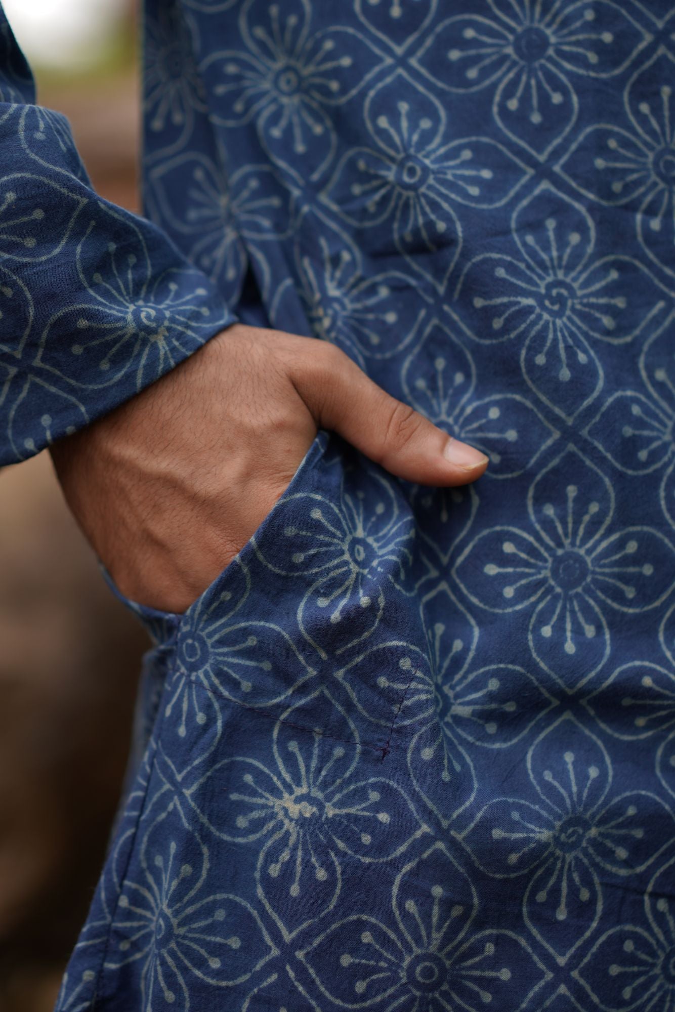 Kurta ajrakh indigo fabriqué à la main pour homme avec une coupe régulière, un col mandarin et deux poches latérales.