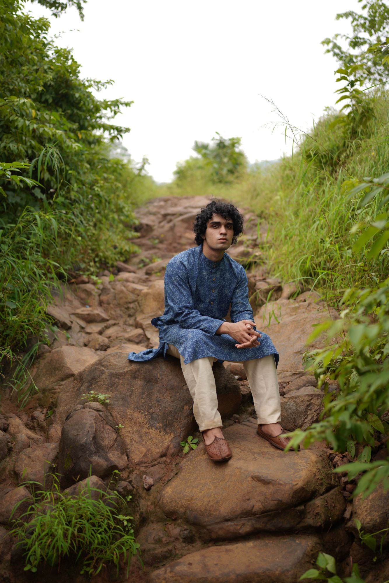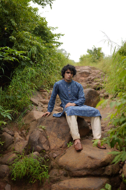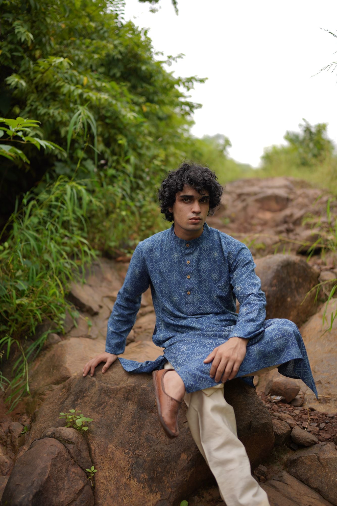 Kurta ajrakh indigo fabriqué à la main pour homme avec une coupe régulière, un col mandarin et deux poches latérales.