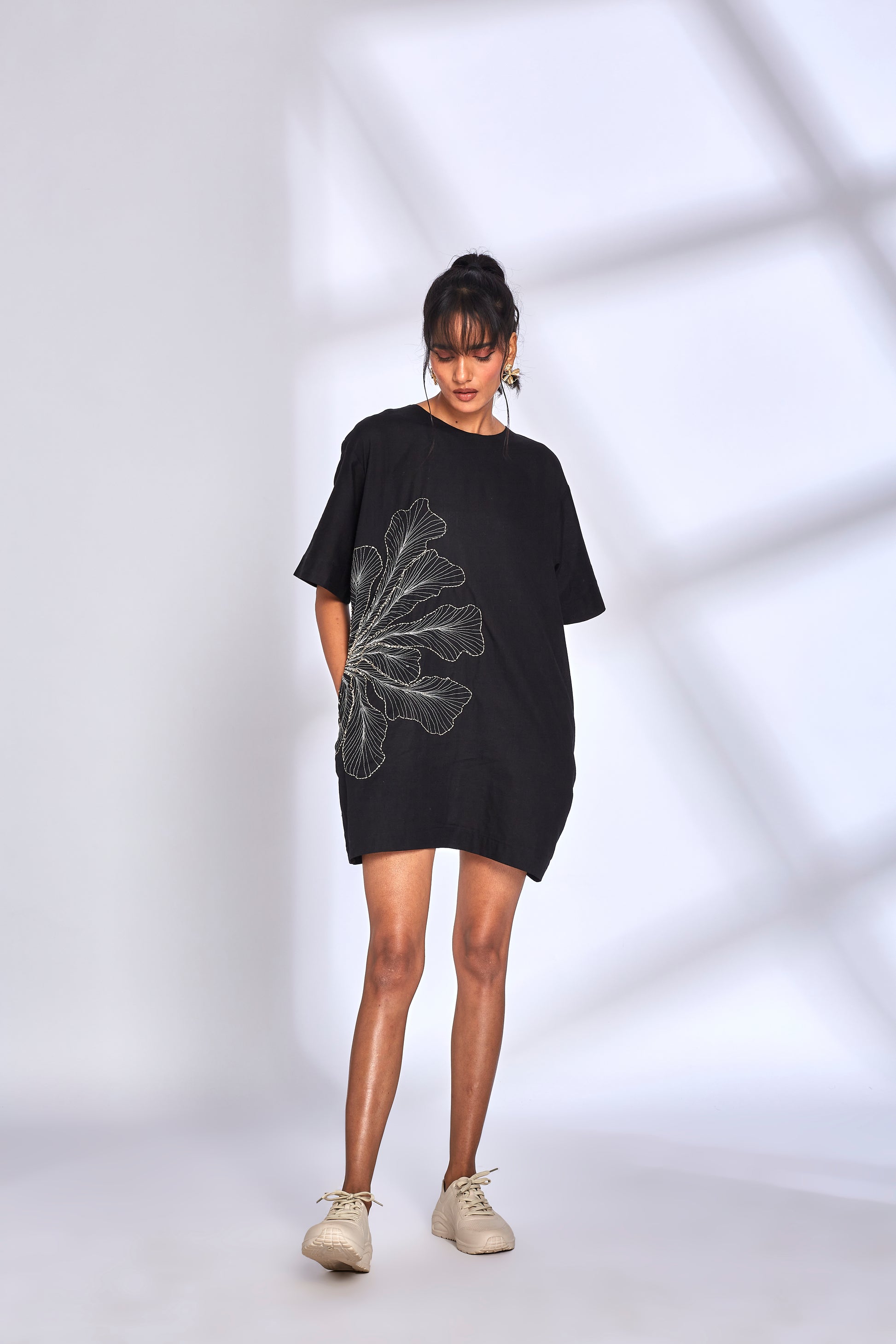 Rehaussez votre style avec notre robe noire Oasis, ornée d'une broderie florale audacieuse sur le côté pour un ensemble qui fait sensation