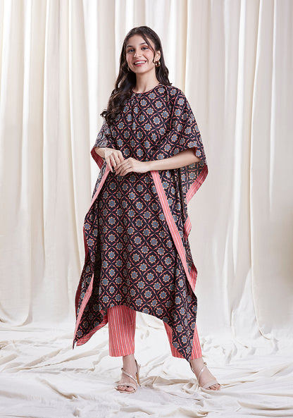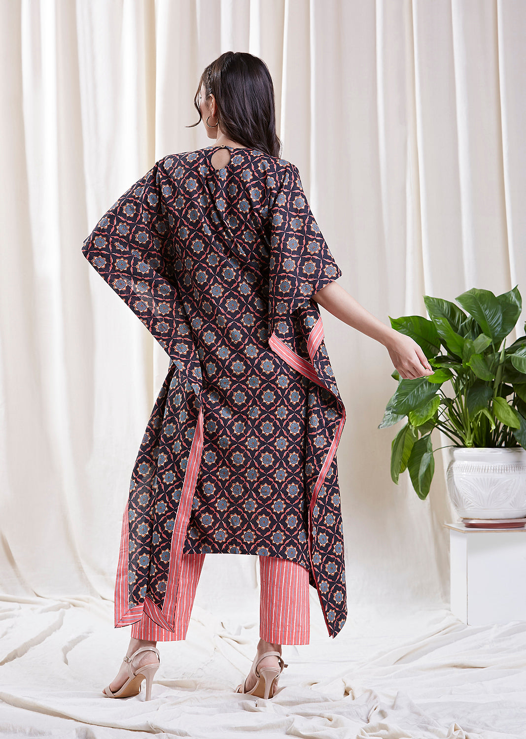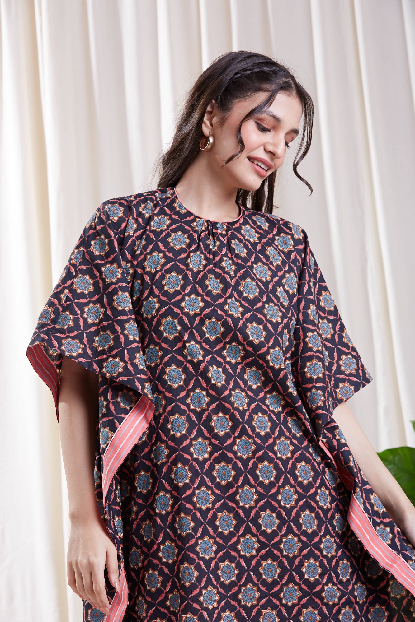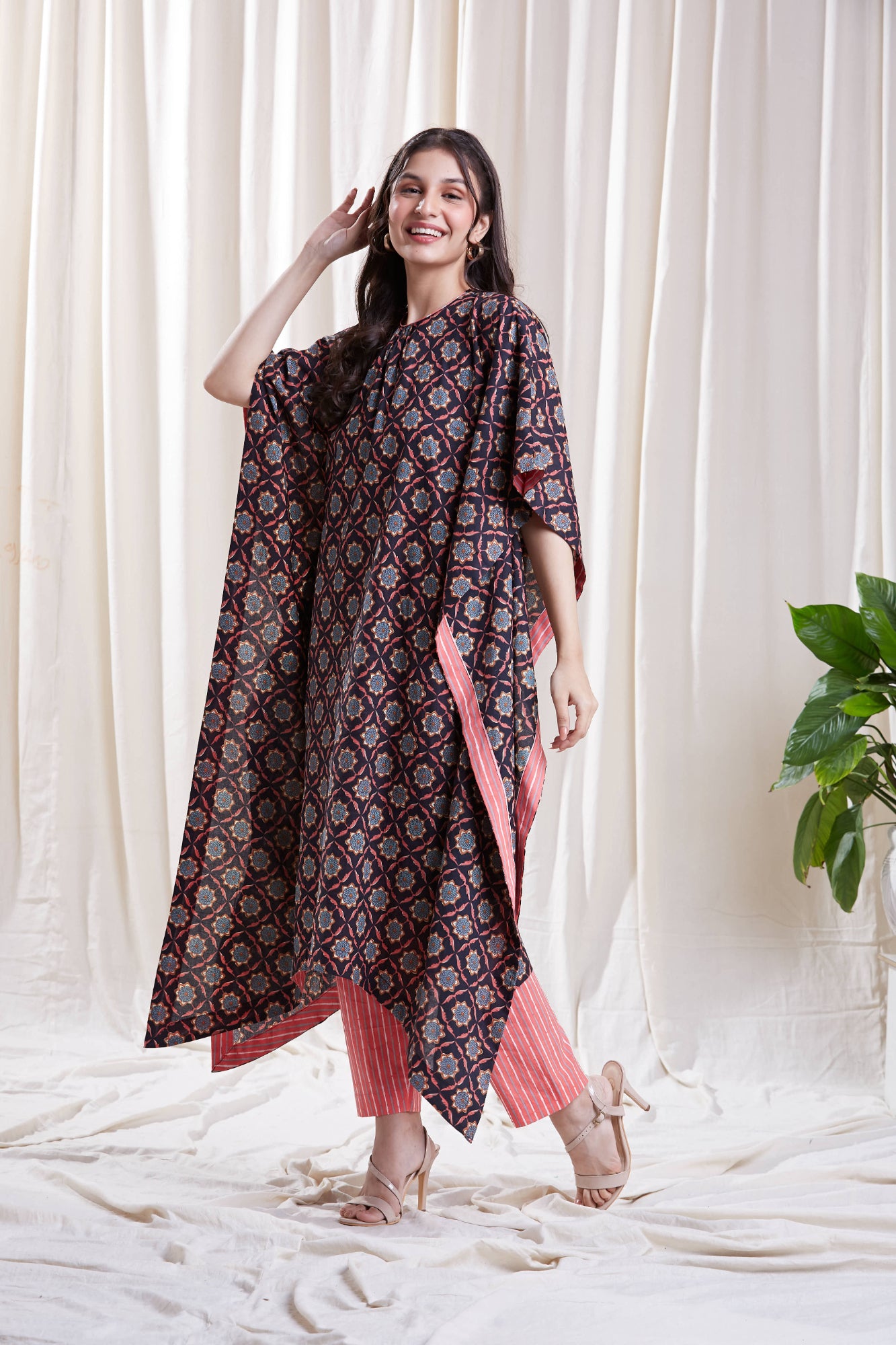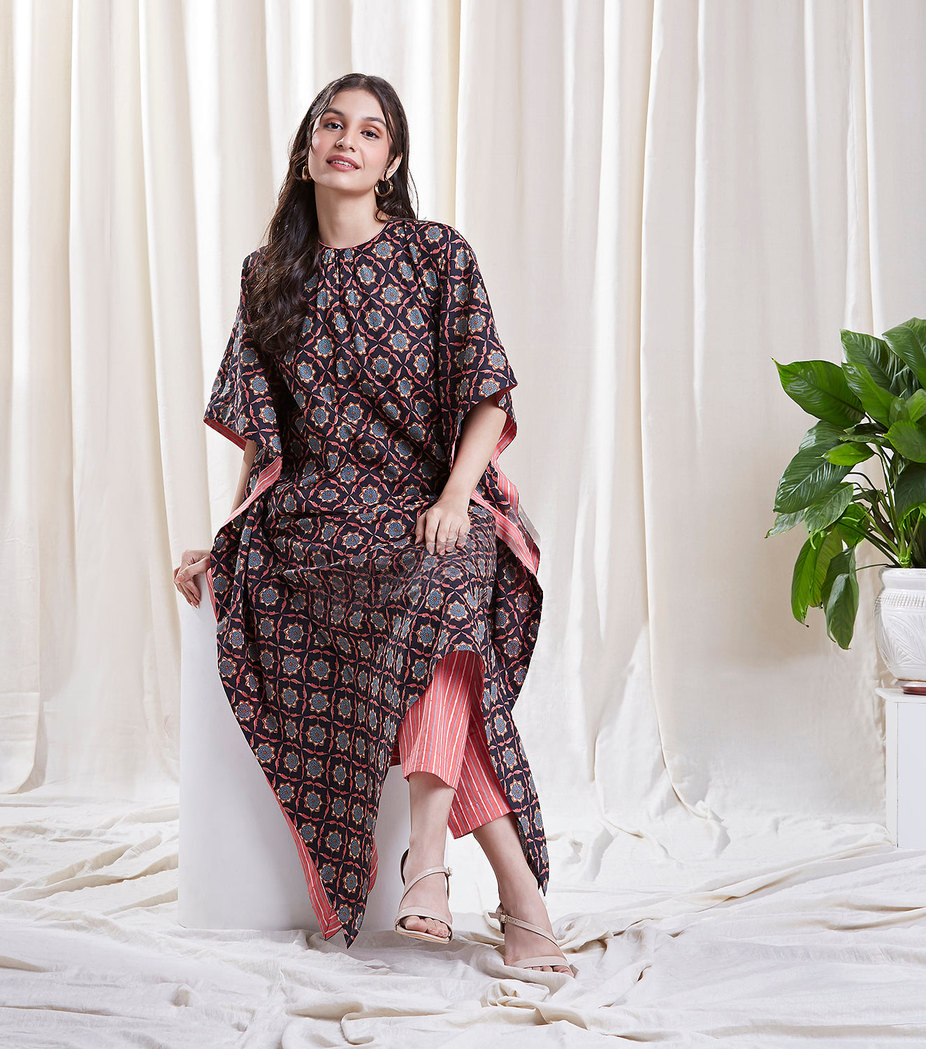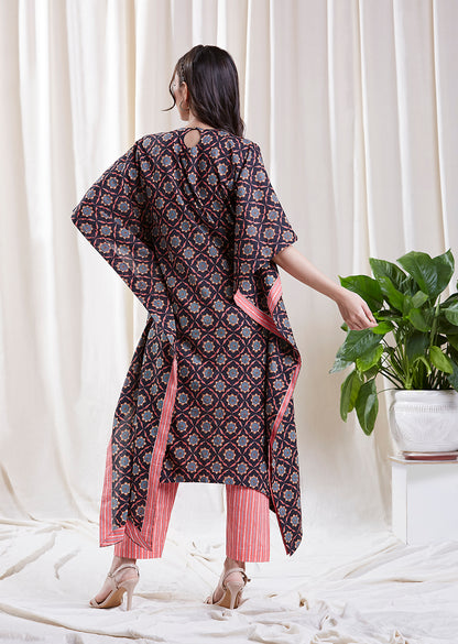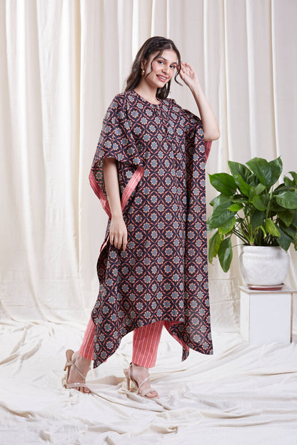The star of this set is the elegant black kaftan, adorned with vibrant pink florals that dance across the soft and breathable cotton fabric. Its relaxed silhouette ensures you feel at ease while exuding an air of sophistication.