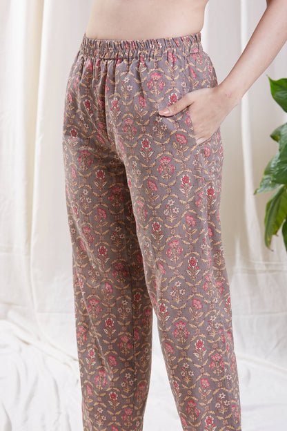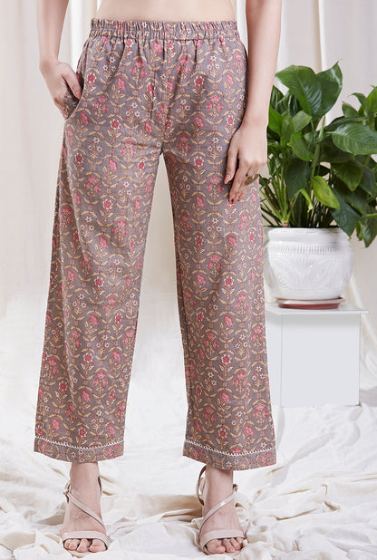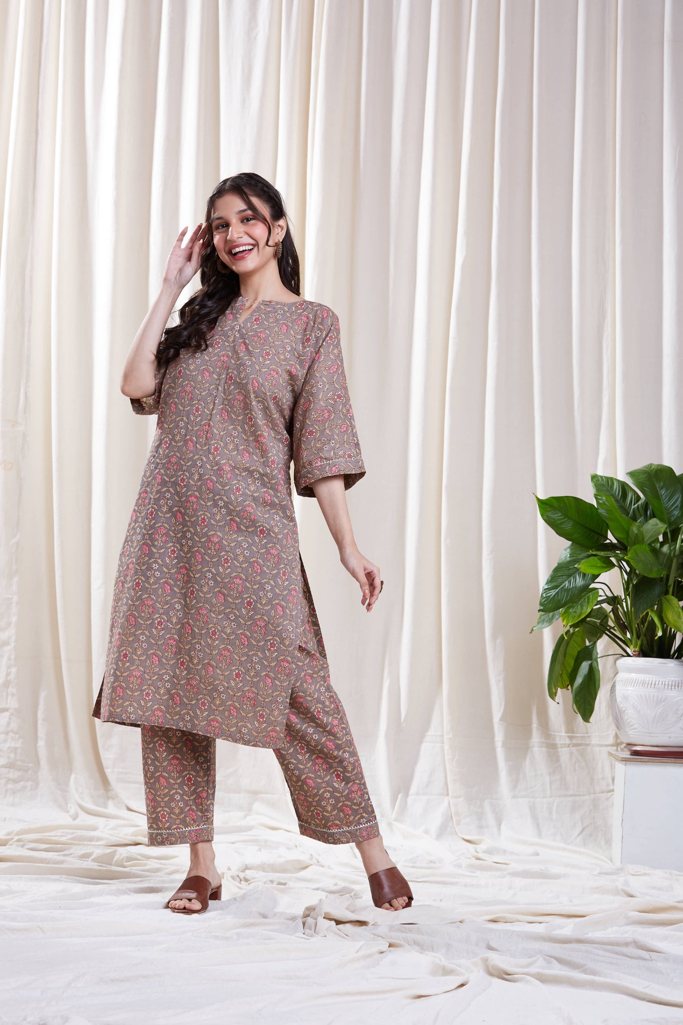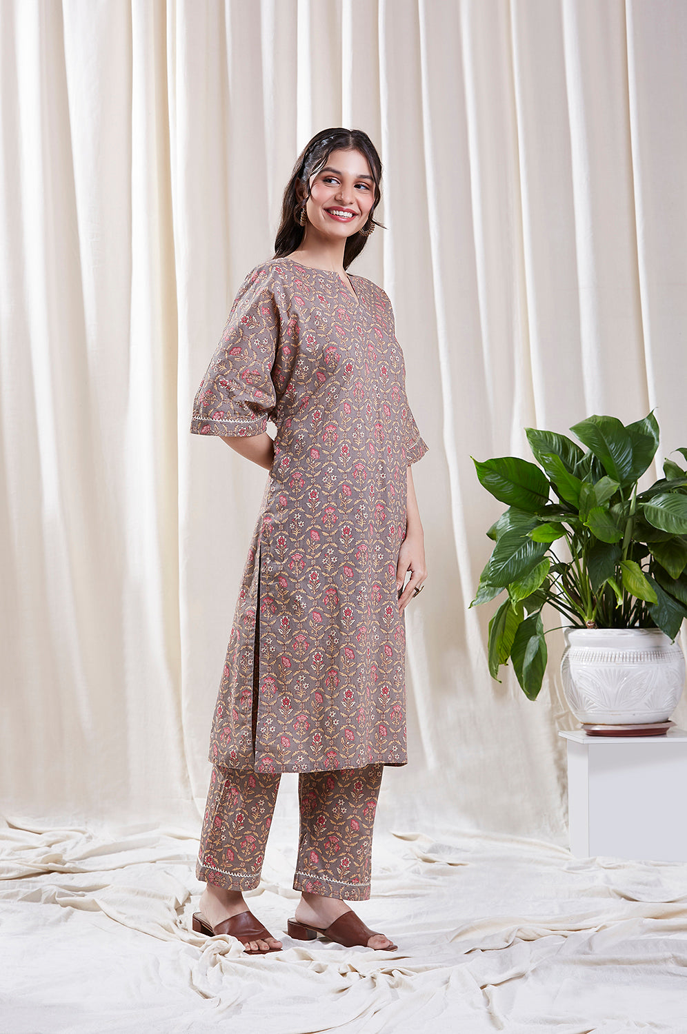 The Isha Grey Kurta is a vision of sophistication with its kimono flared sleeves that exude an air of grace and timeless beauty adorned with delicate pink floral prints on a serene grey canvas. The gota patti detailing adds a touch of tradition, creating a harmonious blend of old-world charm and modern aesthetics.