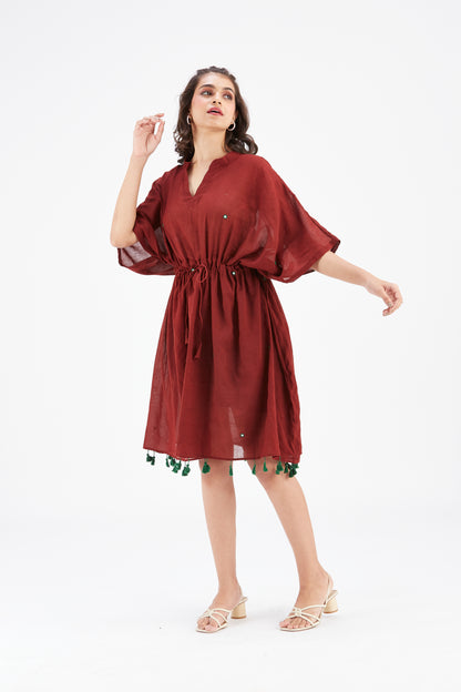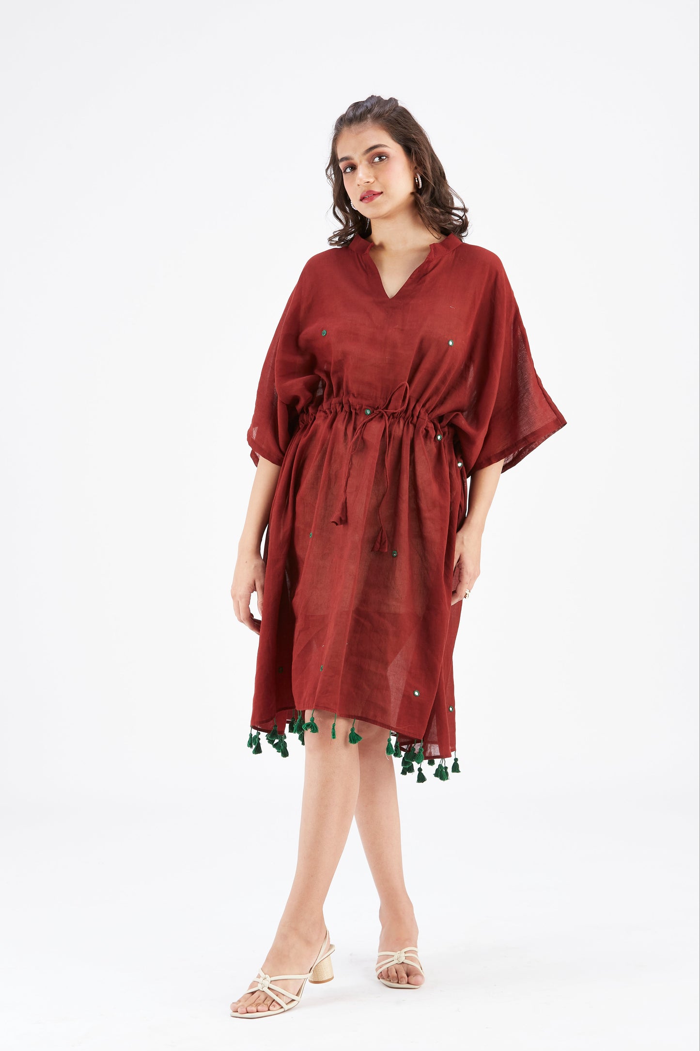 The Meira Maroon Kaftan is the epitome of relaxed luxury. Made from lightweight cotton, this breezy kaftan drapes gracefully over the body, offering both comfort and style. Gathered at the waist to create a flattering, flowy silhouette, it’s a versatile piece that seamlessly transitions from day to night.