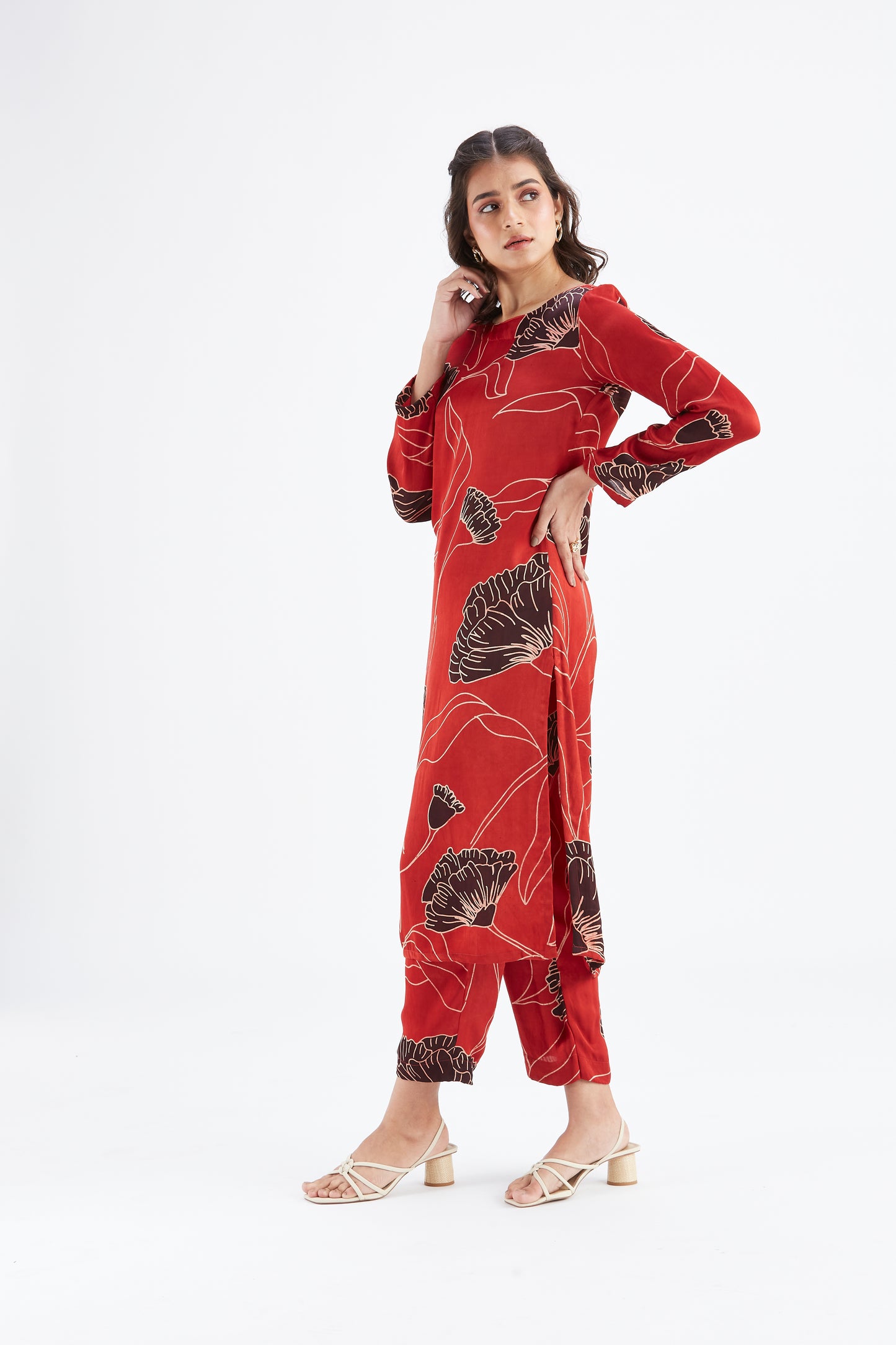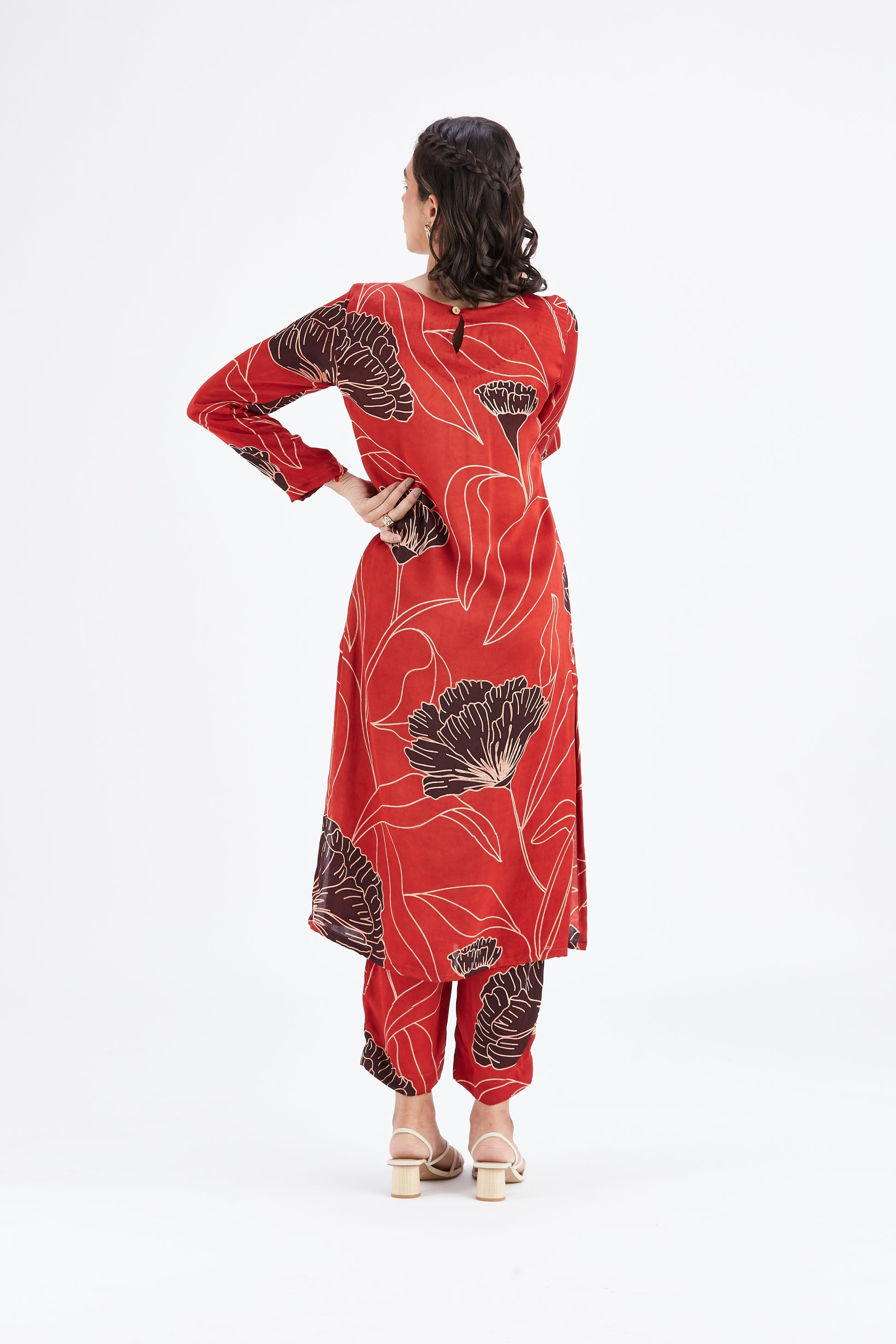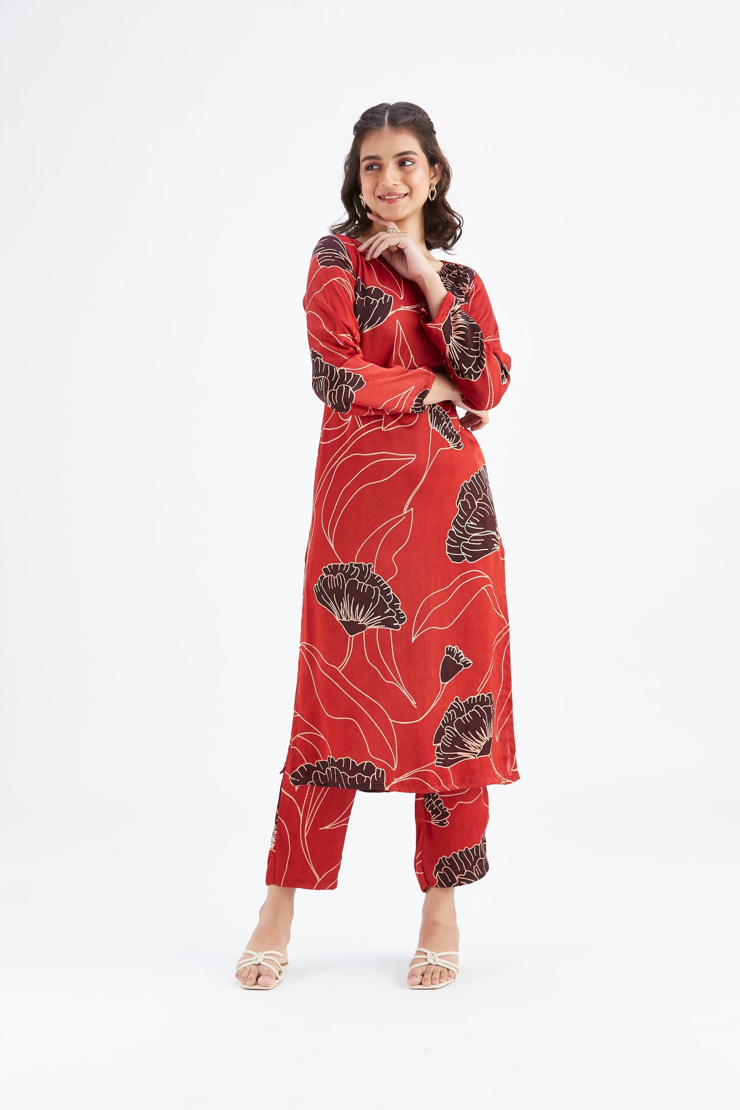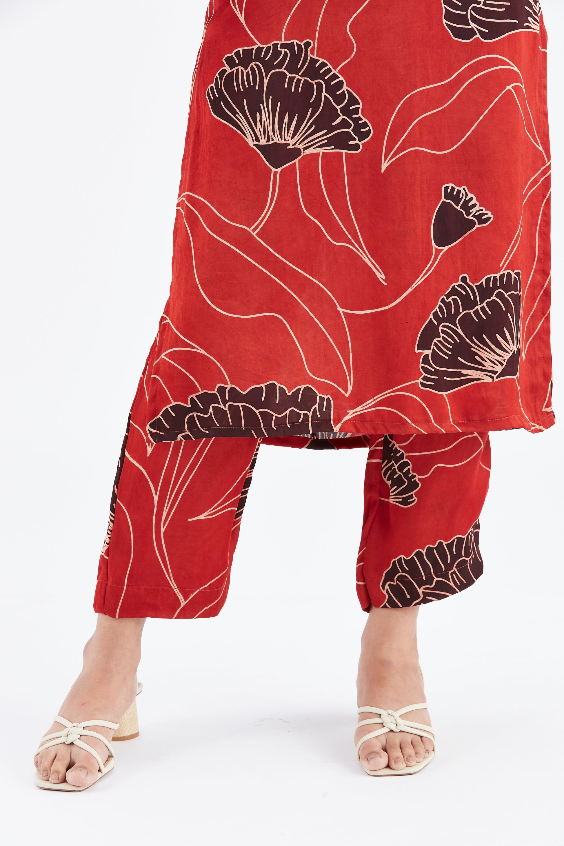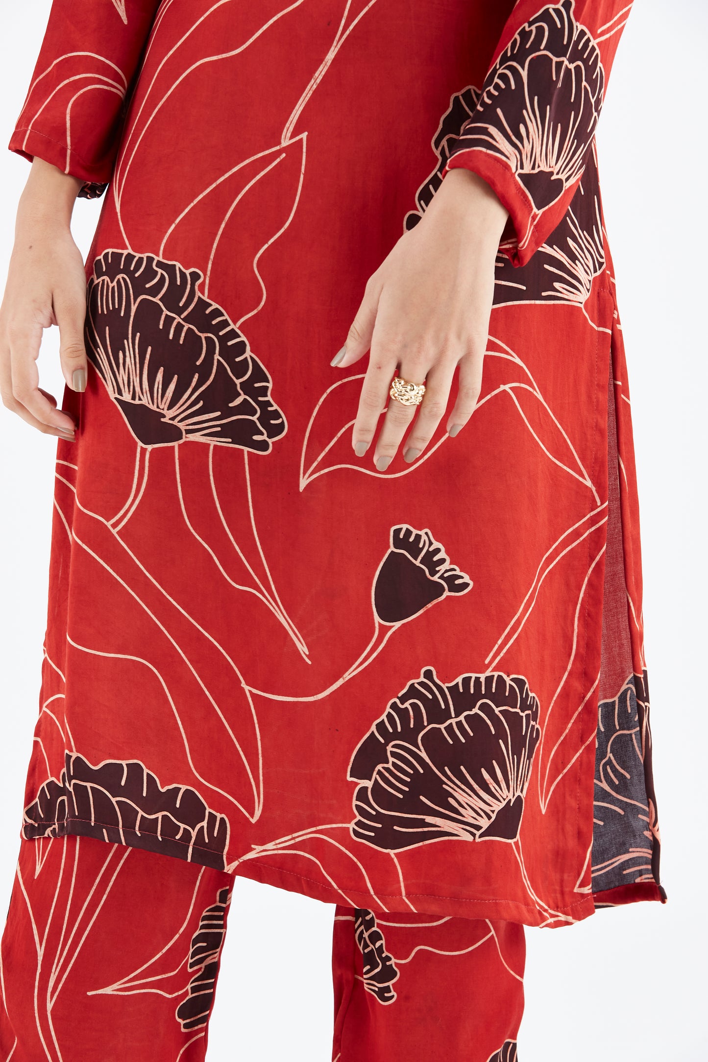 The Yara Red Kurta Set is an elevated essential — crafted in buttery-soft red modal and adorned with an all-over handprinted floral design. The straight-cut, knee-length kurta paired with easy, breathable pants makes it a go-to for both everyday comfort and refined style.