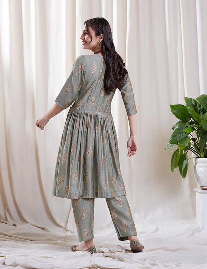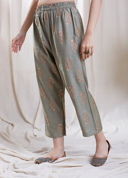 This ensemble is crafted from pure silk viscose, ensuring a luxurious feel against your skin, features lovely prints that capture the essence of Jaipuri floral beauty, adding a touch of vibrancy to your festive wardrobe. The flattering silhouette of the kurta ensures both style and comfort, making it perfect for any occasion. To complete the look, the set includes a matching dupatta that adds an extra layer of grace and a pair of straight pants that offer a modern and chic touch.